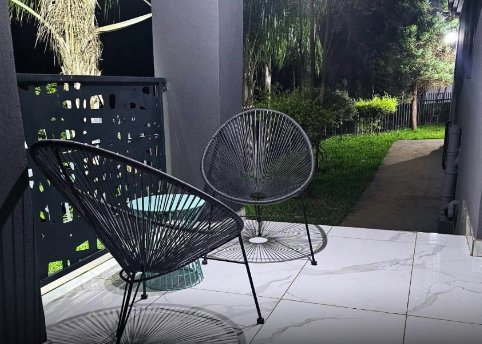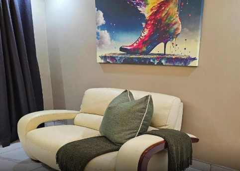 A spacious room featuring a 2-seater leather sofa, TV, workstation, and a patio with coffee table and chairs overlooking the dam and mountains. Enjoy Netflix, Showmax, air-conditioning, a private entrance, communal pool access, and extra comforts.