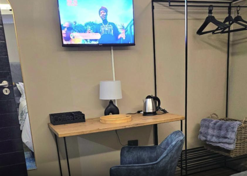 The Comfort Double Room features an en-suite bathroom with a shower and amenities. It offers a private entrance, coffee/tea facilities, TV, a workstation, patio with seating, air-conditioning, free Wi-Fi, Netflix, Showmax, and access to the communal pool.